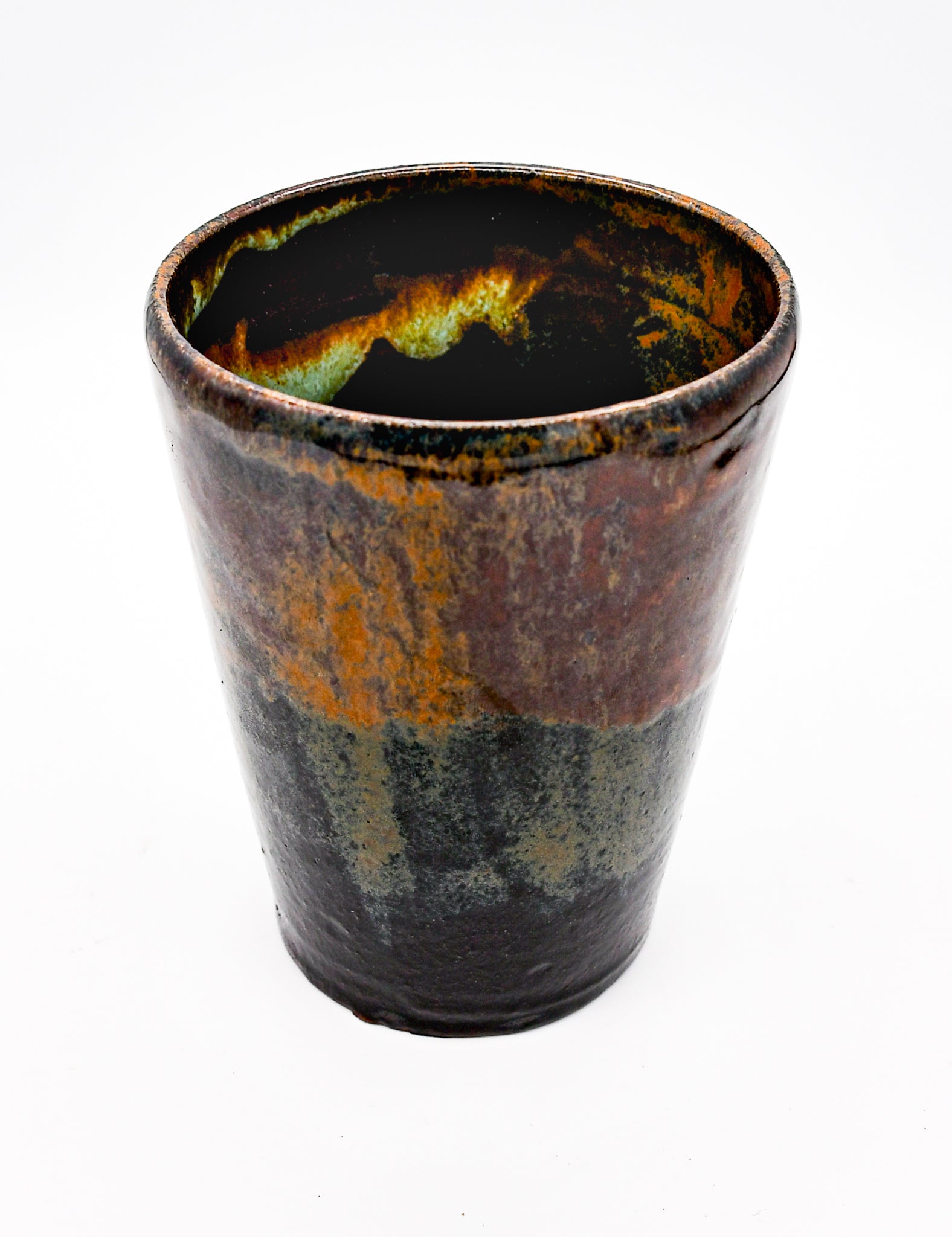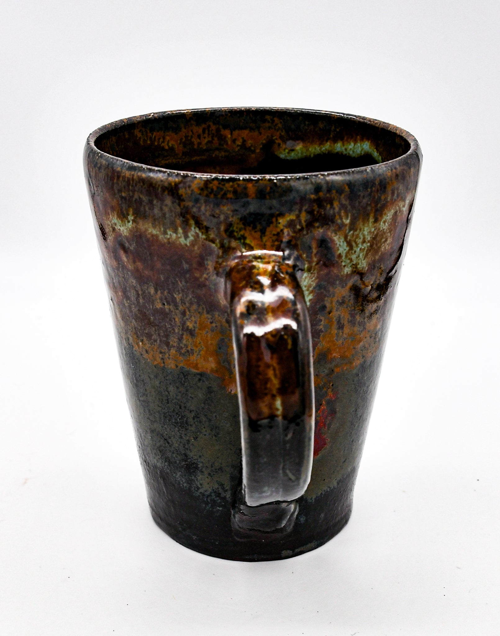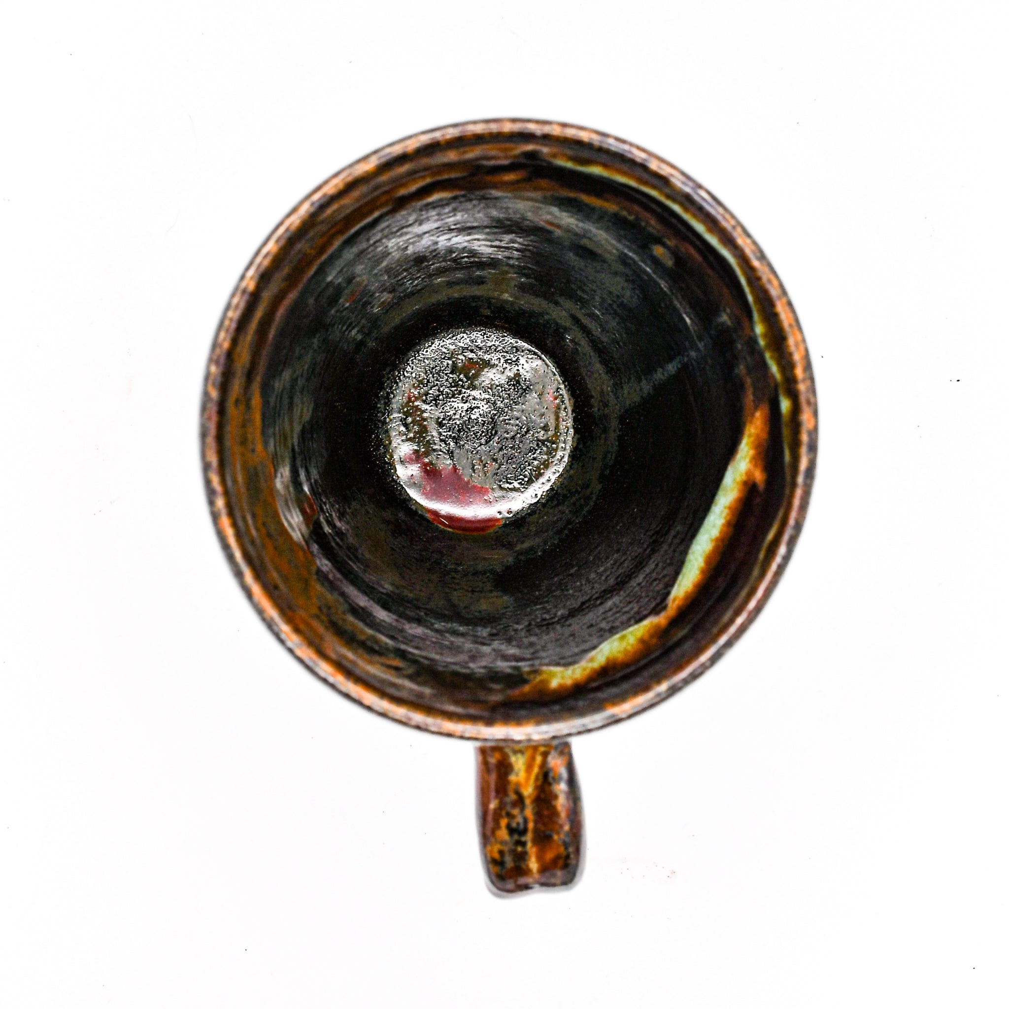 The dark, earthy palette gives the piece a grounded, elemental presence, while the smooth interior provides a striking contrast and a comfortable drinking experience. Each mug is unique, reflecting the intimate dialogue between glaze, clay, and kiln.